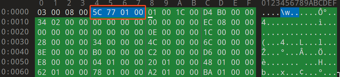 文件内容通常以 0x00080003 开头,可以将它看作是 Magic Number。其中 0x0003 表示 Type 为 RES_XML_TYPE, 0x0008 表示 Header Size,紧跟着 4 个字节 0x0001775c (96092 个字节) 描述整个文件的大小(包含 Header 部分)。